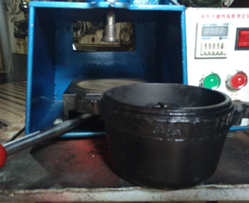 2,安裝研磨碗料缽: 在研磨碗內(nèi),裝好煤樣和鋼球、研磨環(huán)后,其放入底座上的預(yù)定位置處,扳動(dòng)上碗機(jī)構(gòu)的手柄,向右運(yùn)轉(zhuǎn),使研磨碗頂升到位,再將其掛在機(jī)體兩側(cè)的異型螺栓上,擰緊螺母。此時(shí),研磨碗通過鋼球,研磨環(huán)將主軸頂起,使主軸的全部負(fù)荷為284±2N,均勻地施加在八只鋼球上。研磨碗的工作位置是否正確,應(yīng)檢查研磨碗的兩耳與機(jī)體止口平面的間隙是否一致,否則需調(diào)整兩個(gè)異形螺栓的松緊度。